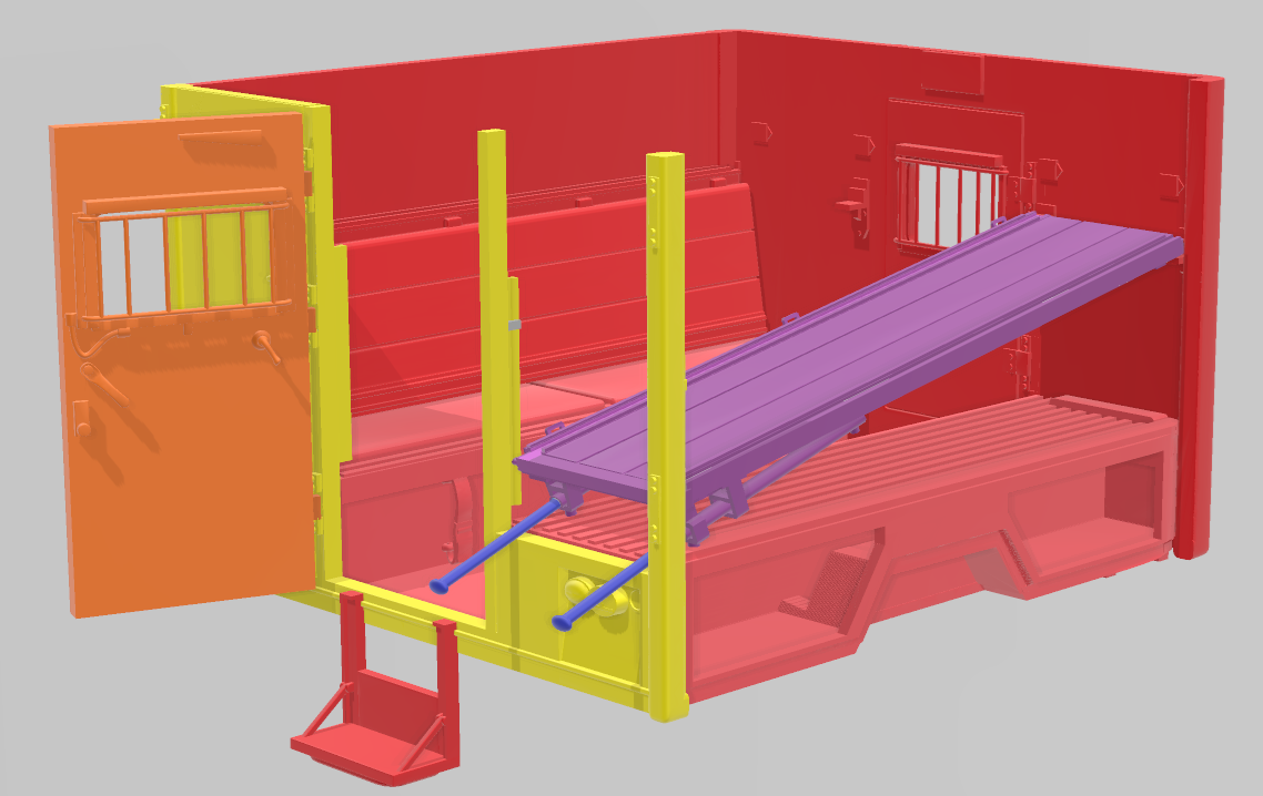 Chassis, bumper, road wheels, nose-cabine, roof, doors, Ambulance shelter, doors and interior, spare wheels, mirrors, front seats and the steering wheel.